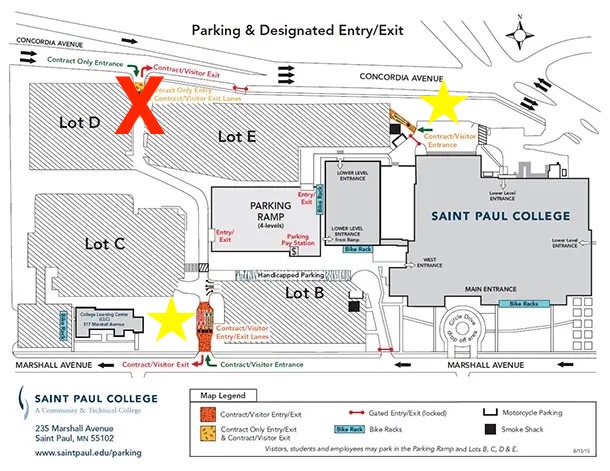 - Saint Paul College Lots and Ramp: The College lots and ramp are available for a small fee. You must enter on either the northeast side of campus off of Concordia Avenue or the south side off of Marshall Avenue (indicated by yellow stars on the map). The northwest entrance off of Concordia Avenue will be closed (indicated by red X). Please download the map or view it below. Further information can be found on the Saint Paul College website.